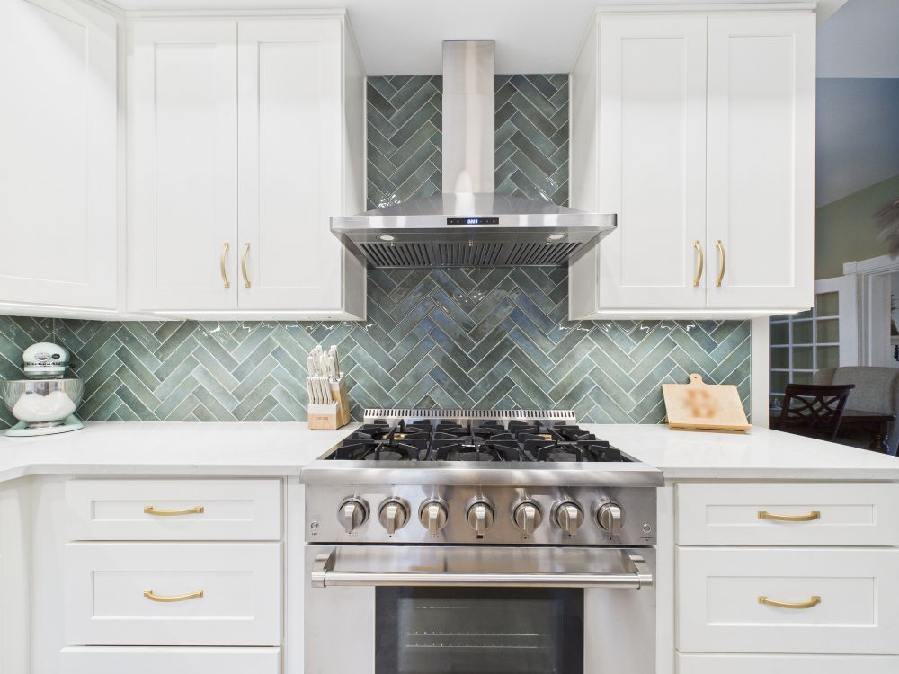 This kitchen remodel features white cabinets, a large center island, modern lighting, light surfaces, and a streamlined layout that improves storage and workflow while creating a brighter, more open space for daily meals and family gathering.